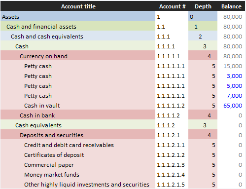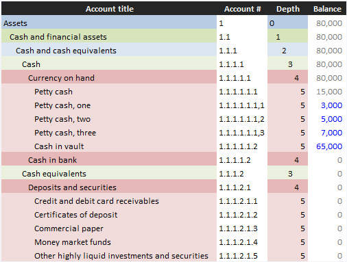 For example, if the entity had only two assets (petty cash of 5,000 and cash in vault of 65,000), its COA would comprise: