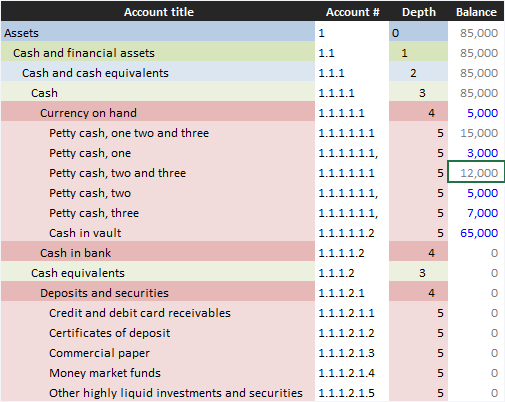 If a value is entered into an account that would otherwise be a summation account (if without a value), it changes into a posting account and the summation moves one step up in the hierarchy. For example, 65,000 in the vault, 5,000 in petty cash, and 5,000 in an unspecified location (e.g. manager's pocket).